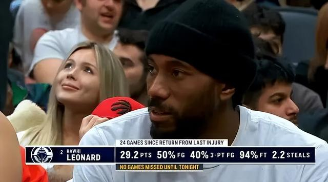 上次伤愈复出之后,伦纳德打了24场比赛,从11月24日复出之后,到今天之前,伦纳德复出之后是保持全勤的。